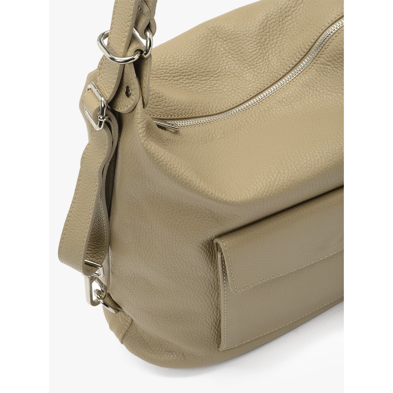 Tõmblukuga kinnitus. Suur kott, sobib A4 formaadile. Mudelil on 2 sisetaskut, 1 välistasku ja reguleeritav 125 cm pikkune rihm. Kõrgus: 30 cm Laius: 31 cm Sügavus: 15 cm Sellel on hõbedased dekoratiivsed elemendid.