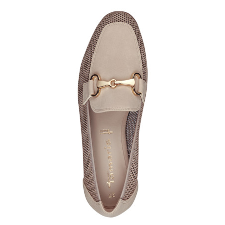 Erinevate detailidega kaunistatud beežid kingad.